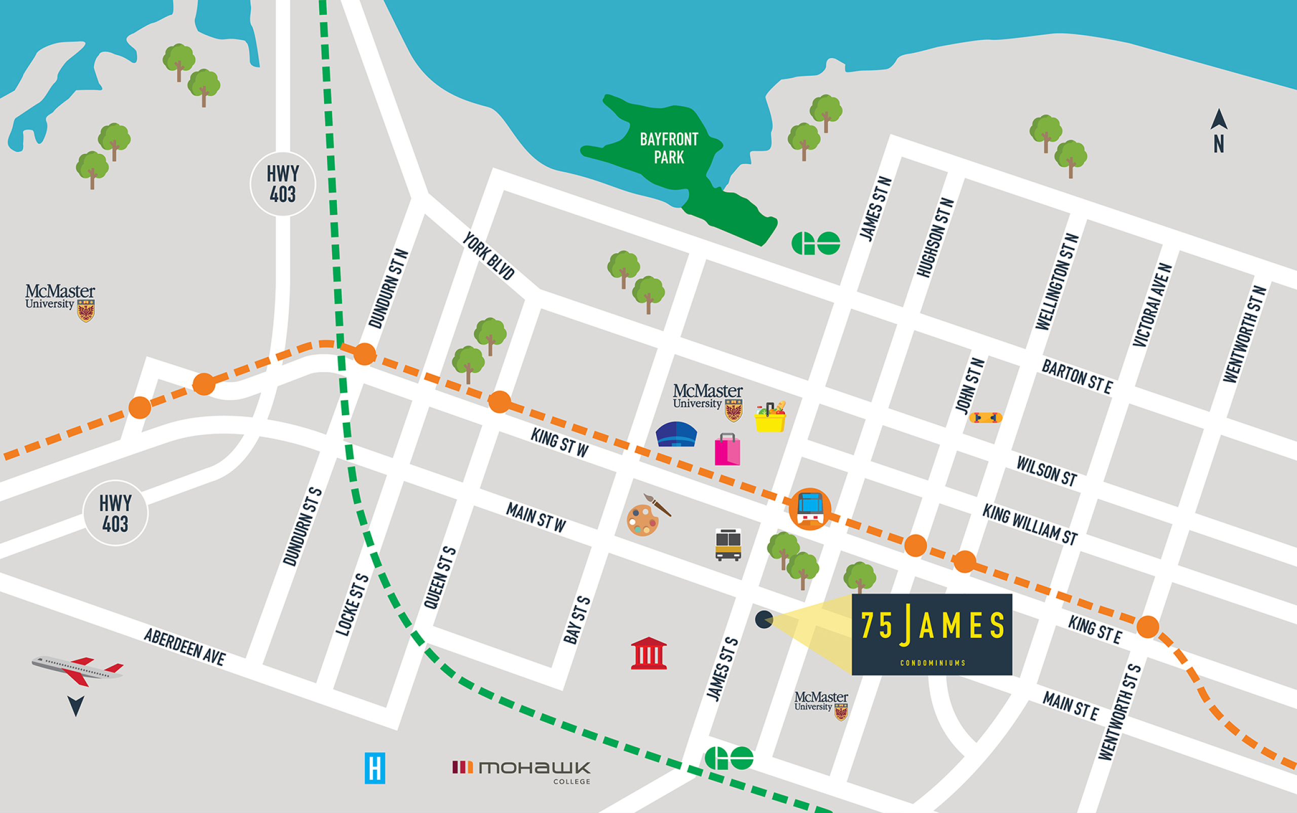For those who need to travel further, 75 James is conveniently located near major transportation hubs, including the Hamilton GO Centre and the John C. Munro Hamilton International Airport. The location also provides easy access to major highways and transit routes, making it easy to get around the city and beyond.