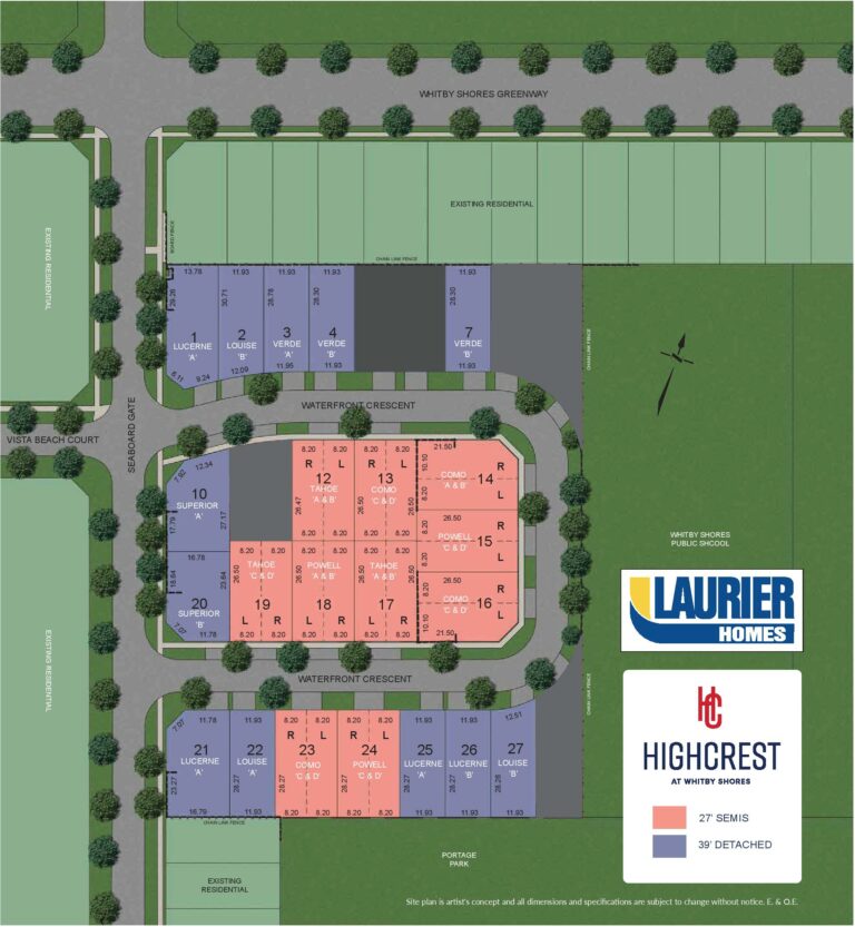 Highcrest is a new development by Laurier Homes. Prices are currently estimated to be starting from $1,900,000+. Featuring a new home community adjacent to Lake Ontario offering a collection of waterfront lifestyle semis and spacious singles up to 2,950 Sqft. Highcrest is located in Whitby Shores nearby shopping districts, dining options, open greenspaces & parks, and it also provides convenient transit and highway access. The project is estimated to be completed on 2024.