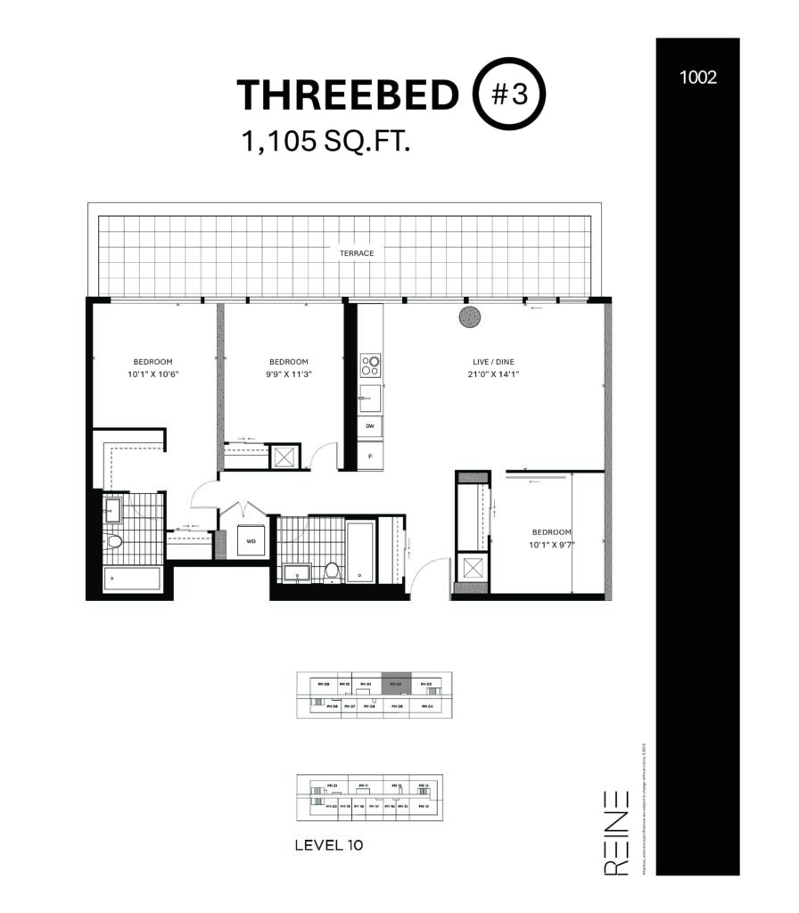 | Three Bed #3 | 3 | 2 | 1,105 |