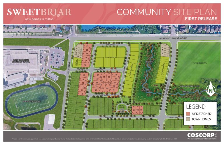Sweet Briar is a new single-family home and townhome development by Coscorp Inc. Prices estimated to be starting from $960,000 - $1,300,000 and will feature 38 units. Sweet Briar is nearby Omagh Park and the Milton GO Station. The project is estimated to be completed in 2025 and will be located on Louis St. Laurent Ave and Fourth Line at the Omagh neighbourhood in Milton.