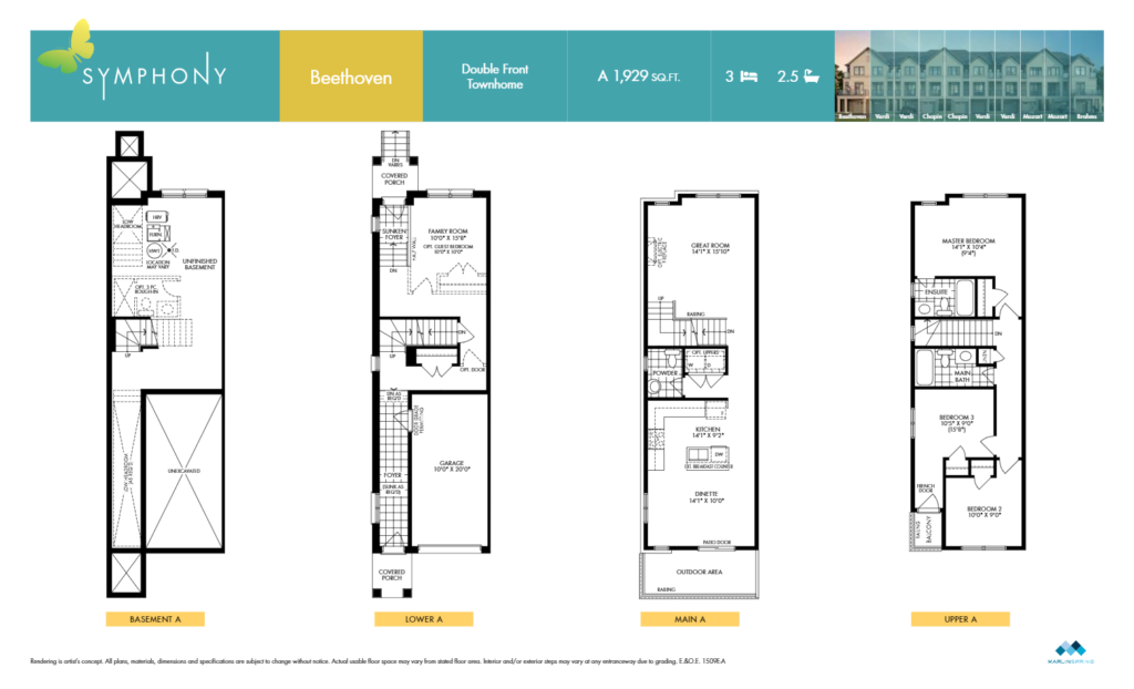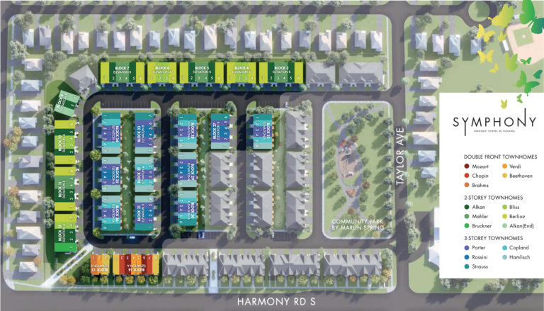 Symphony Towns is a new townhome development by Marlin Spring. Prices estimated to be starting from $904,990+ and will feature a total of 212 units including 2-storey and 3-storey with backyard space. Surrounding Symphony Towns, you will find beautiful parks such as Knights of Columbus Park and Martindale Park, including a community parkette centered around the homes for residents. The development is also minutes away from HWY 401 and Oshawa GO Station. Symphony Towns is estimated to be completed in 2021 and will be located on 250 Harmony Road South at the Donevan neighbourhood in Oshawa.