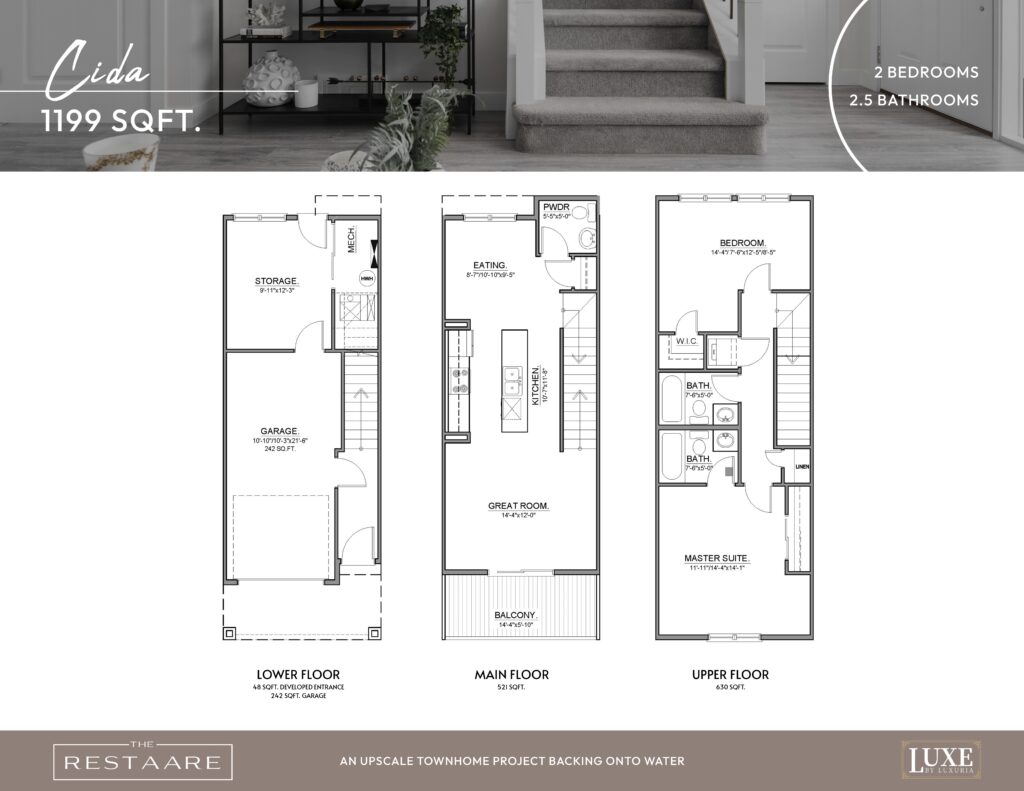 Outside, The Restaare showcases premium siding with accents of Hardie and cultured stone, as per architectural design. Enjoy the convenience of private walkways to each unit, a double-car (or tandem) garage per plan, premium sliding balcony doors, and a unique courtyard park.